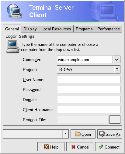 Windows 2000™ desktop named win.example.com using the RDPv5 protocol is shown in