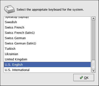 Select a keyboard layout from the list (for example, U.S. English) and click OK.