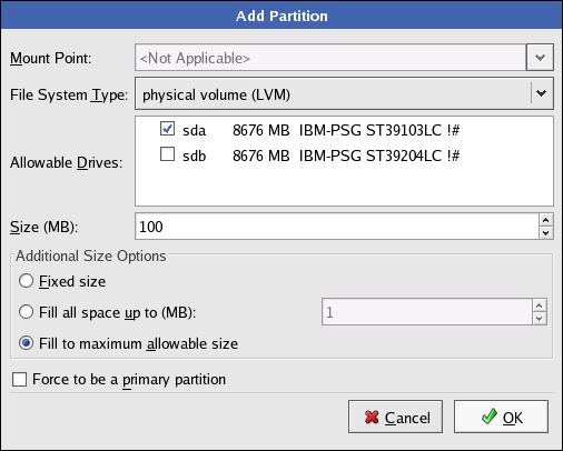physical volume size, or select Fill to maximum