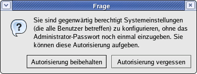Es wird empfohlen, dass bevor Sie sich von einer Konsole entfernen, an der PAM l�uft, die Timestamp-Datei gel�scht wird. Um dies innerhalb der grafischen Umgebung zu tun, klicken Sie auf das Authetifizierungssymbol im Panel. Wenn das Dialog-Fenster erscheint, klicken Sie den Button Autorisierung vergessen.