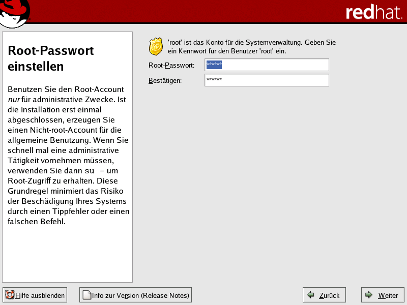 Das root-Passwort muss mindestens sechs Zeichen enthalten. Bei seiner Eingabe wird es nicht im Bildschirm angezeigt. Sie m�ssen das Passwort zwei Mal eingeben; stimmen die beiden Eingaben nicht �berein, werden Sie vom Installationsprogramm aufgefordert, die Eingabe zu wiederholen.