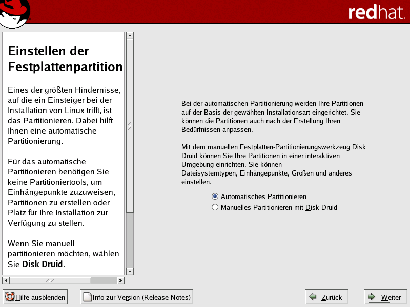 Sie k�nnen in diesem Bildschirm entscheiden, ob Sie das automatische Partitionieren oder manuelles Partitionieren mit Disk Druid durchf�hren wollen.