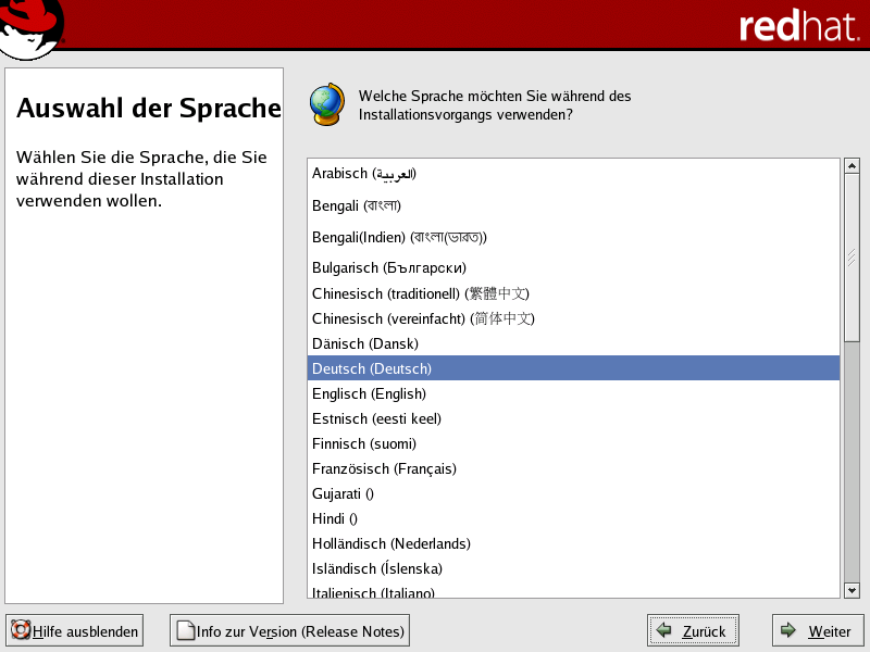 Durch die Auswahl der richtigen Spracheinstellung wird zugleich eine Vorauswahl f�r die Zeitzone getroffen, die Sie in einem sp�teren Bildschirm der Installation festlegen k�nnen. Das Installationsprogramm versucht, anhand Ihrer eingestellten Sprache die richtige Zeitzone f�r Ihren Standort auszuw�hlen.
