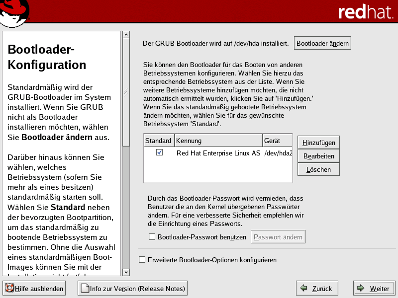 | | Bootloader wie LOADLIN und System Commander werden als Bootloader von Drittanbietern angesehen und nicht von Red Hat unterst�tzt. |