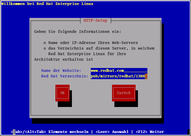 Geben Sie den Namen oder die IP-Adresse der HTTP-Site ein, von der installiert werden soll, sowie den Namen des Verzeichnisses, in dem sich die RedHat-Installationsdateien f�r Ihre Architektur befinden. Enth�lt die HTTP-Site beispielsweise das Verzeichnis /mirrors/redhat/arch/RedHat, geben Sie /mirrors/redhat/arch/ ein (wobei arch mit der entsprechenden Architektur ersetzt wird, wie i386, ia64, ppc, or s390). Wenn alle Angaben richtig sind, erhalten Sie die Meldung, dass base/hdlist abgerufen wird.