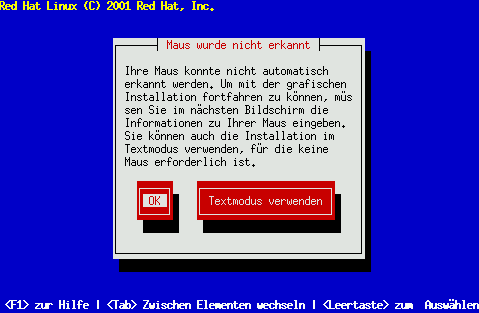 Sie k�nnen mit der GUI-Installation fortfahren oder sich f�r die Installation im Textmodus entscheiden, f�r die keine Maus erforderlich ist. Wenn Sie sich f�r die GUI-Installation entscheiden, m�ssen Sie dem Installationsprogramm die Informationen zu Ihrer Mauskonfiguration liefern.