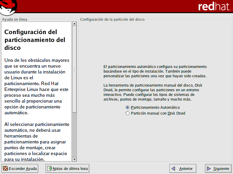 En esta pantalla, puede elegir entre realizar un particionamiento autom�tico o un particionamiento manual con Disk Druid.