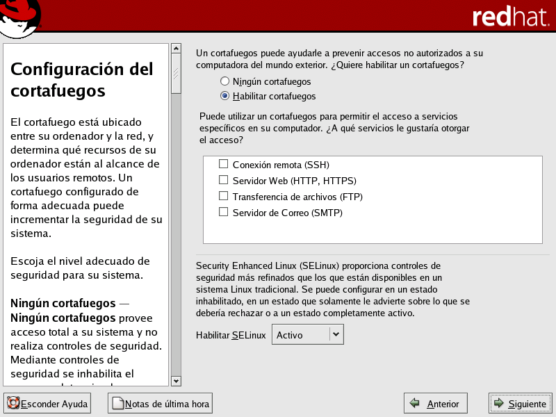 Adicionalmente, puede configurar SELinux (Security Enhanced Linux) durante la instalaci�n de Red Hat Enterprise Linux.