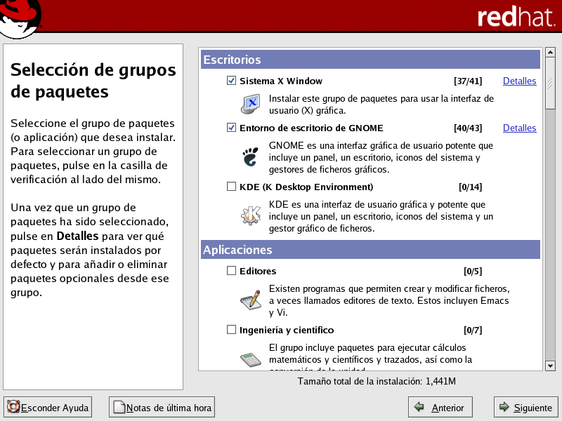 Una vez seleccionado un grupo de paquetes, haga clic en Detalles para visualizar los paquetes que se instalar�n por defecto y los paquetes opcionales que desee eliminar o a�adir a ese grupo.