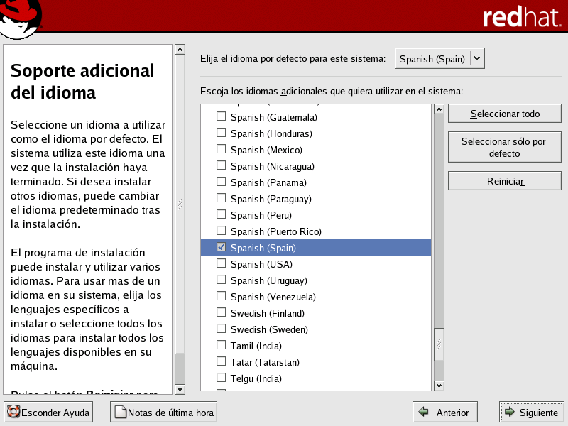 Debe seleccionar un idioma para usarlo como idioma por defecto. El idioma por defecto es aquel que ser� utilizado por el sistema una vez que la instalaci�n se haya completado. T�picamente, el idioma por defecto es el mismo que seleccion� durante la instalaci�n.