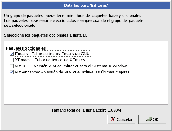 Una vez seleccionado un grupo de paquetes, haga clic en Detalles para visualizar los paquetes que se instalar�n por defecto y los paquetes opcionales que desee eliminar o a�adir a ese grupo.