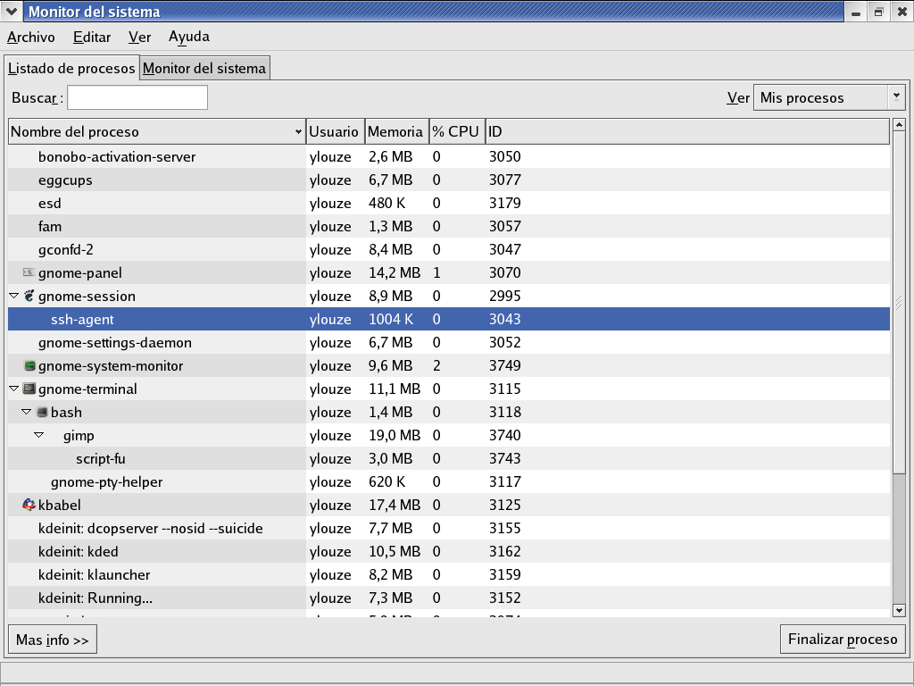 Sin embargo, el Monitor del Sistema GNOME va un paso m�s all� incluyendo tambi�n representaciones gr�ficas del CPU, utilizaci�n de memoria y de intercambio, junto con un listado tabular de la utilizaci�n del espacio en disco. Un ejemplo del Listado de procesos del Monitor del Sistema GNOME aparece en la Figura 2-1.