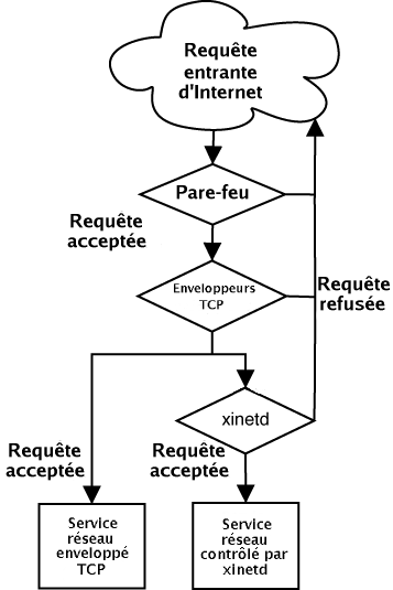 Lorsqu'une tentative de connexion � un service envelopp� avec TCP est effectu�e, le service cherche d'abord les fichiers d'acc�s des h�tes (hosts access) (/etc/hosts.allow et /etc/hosts.deny) afin de d�terminer si l'h�te client est autoris� ou non � se connecter. Dans la plupart des cas, il utilise ensuite le d�mon syslog (syslogd) pour �crire le nom de l'h�te envoyant la requ�te et le nom du service demand� dans /var/log/secure ou /var/log/messages.