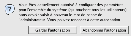 Avant de s'absenter d'une console sur laquelle une estampille PAM est activ�e, il est recommand� de supprimer le fichier d'estampille. Pour effectuer cette op�ration dans un environnement graphique, cliquez sur l'ic�ne d'authentification sur le panneau. Lorsque la bo�te de dialogue appara�t, cliquez sur le bouton Abandonner l'autorisation.