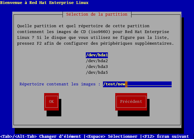 Saisissez le nom du p�riph�rique de la partition contenant les images ISO Red Hat Enterprise Linux. Il existe �galement un champ intitul� R�pertoire contenant les images.