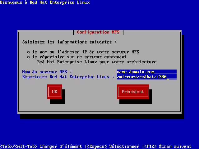 Si le serveur NFS exporte une image miroir de l'arborescence d'installation de Red Hat Enterprise Linux, saisissez le r�pertoire qui contient le r�pertoire RedHat/. (Si vous ne connaissez pas le chemin de ce r�pertoire, contactez votre administrateur syst�me.) Par exemple, si le site NFS contient le r�pertoire /mirrors/redhat/arch/RedHat/, saisissez /mirrors/redhat/arch/ (o� arch est remplac� par le type d'architecture de votre syst�me, comme i386, ia64, ppc ou s390). Si toutes les informations ont �t� correctement sp�cifi�es, un message appara�tra indiquant que le programme d'installation de Red Hat Enterprise Linux est maintenant en cours d'ex�cution.