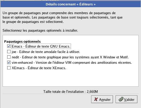 Une fois que vous avez s�lectionn� un groupe de paquetages, cliquez sur D�tails afin de voir les paquetages qui seront install�s par d�faut et afin d'en ajouter ou d'en supprimer.