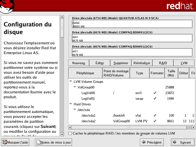 volume physique (LVM) — La cr�ation d'une ou de plusieurs partitions de volume physique (LVM) vous permet de cr�er un volume logique LVM. LVM peut am�liorer la performance lors de l'utilisation de disques physiques. Pour davantage d'informations concernant LVM, reportez-vous au Guide d'administration syst�me de Red Hat Enterprise Linux.