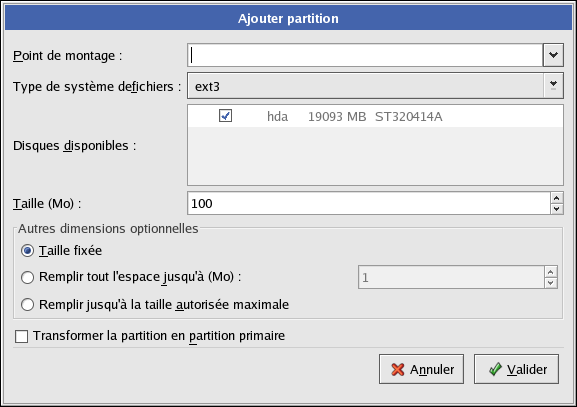 Point de montage�: Saisissez le point de montage de la partition. Par exemple, si cette partition doit correspondre � la partition racine, saisissez /. Saisissez /boot pour la partition /boot, etc. Le point de montage appropri� pour votre partition peut �galement �tre choisi dans le menu d�roulant.