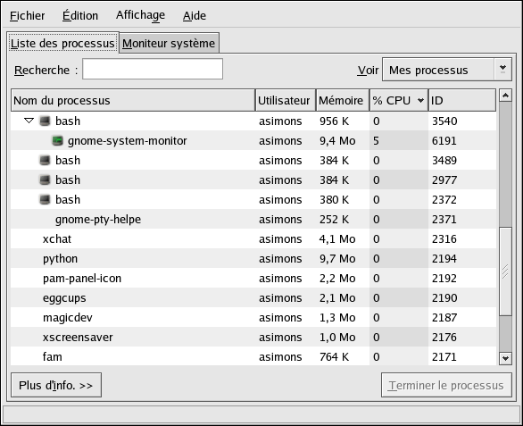 Figure 2-1. Affichage de la Liste des processus par le Moniteur syst�me de GNOME