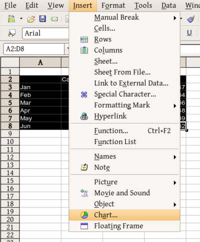 To create a chart, first highlight (select) the data to be included in the chart. The selection does not need to be in a single block, as shown below; you can also choose individual cells or groups of cells (columns or rows). See Chapter 1 (Introducing Calc) for more about selecting cells and ranges of cells.