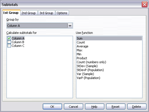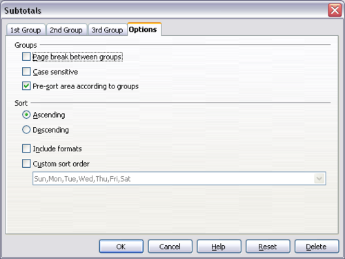 If you use more than one group, then you can also arrange the subtotals according to choices made on the dialog’s Options page, including ascending and descending order or using one of the predefined custom sorts defined in Tools > Options > OpenOffice.org Calc > Sort Lists.