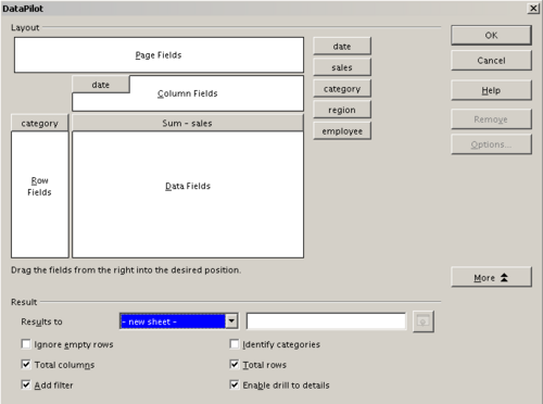 - The DataPilot dialog (Figure 3) has four layout areas (large white fields) and five fields that look similar to buttons. These small fields are the titles of the different columns of your list.