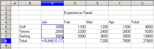 This small exercise might be useful for a first contact with the program, but it shows only a very small fraction of the tasks in an office. To create such a sales overview, you also need the orginal data. That is, before you can use a spreadsheet for creating the sales overview, you need to add many single purchases from different lists and then enter the sums into the relevant fields C5 to F7.