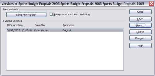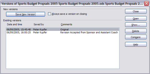 Most documents go through many drafts. It is often useful to save all versions of a document. You do this by saving a copy of the document (under a different name) after each revision, or you could use Calc’s version feature. To use version management in Calc: