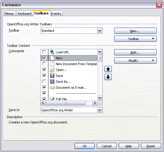 You can customize toolbars in several ways, including choosing which icons are visible and locking the position of a docked toolbar, as described in Chapter 1 (Introducing OpenOffice.org). This section describes how to create new toolbars and add other icons (commands) to the list of those available on a toolbar.