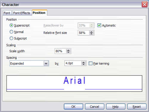 Use this page to set the text position relative to the baseline when you need to insert subscripts or superscripts.