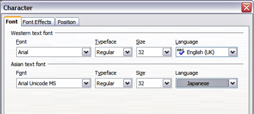 The page is divided into three parts. The top and bottom parts have the same functionality as described above, while in the middle part you can specify the Asian text font and its attributes.