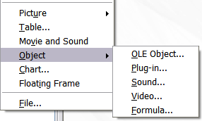 Impress offers the capability of inserting in a slide various types of objects such as music or video clips, Writer documents, Math formulas, generic OLE objects and so on. A typical presentation may contain movie clips, sound clips, OLE objects and formulas; other objects are less frequently used since they do not appear during a slide show.