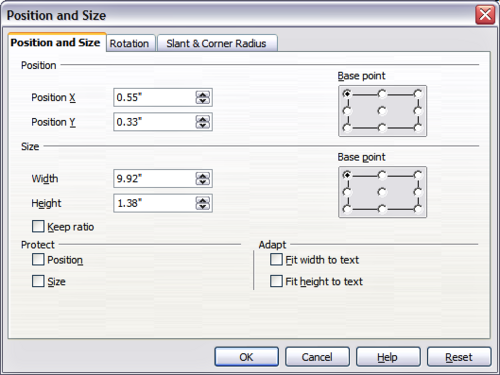 To more accurately control the shape and size as well as the position of the default text area, instead of using the mouse it is better to access the Position and Size dialog box. To do that, first select the rectangular area by clicking on any point inside it, then either press F4 or from the main menu select Format > Position and Size. The dialog box shown below is displayed.