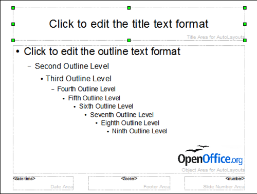When a slide master is opened for editing, it contains five areas, as shown below: