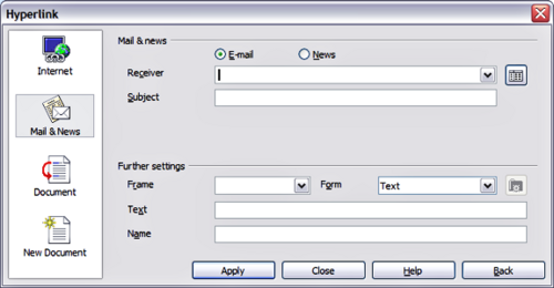 For a Mail and News type hyperlink, specify whether it is a mail or news link, the receiver address and for email, also the subject.