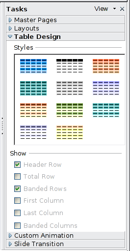 Tables are a powerful mechanism to convey structured information quickly, so they represent an important tool when creating a presentation. Since OpenOffice.org version 3.0, tables are supported natively in Impress, which means that there is no need to embed a Calc spreadsheet or a Writer text table although in some circumstances it makes sense to do so as the functionalities provided by a Calc spreadsheet are far superior to those provided by an Impress table.