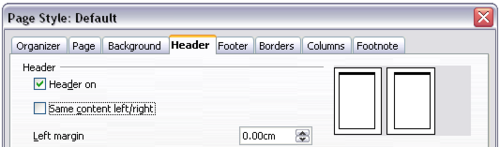 - On the Header page of the Page Style: Default dialog box, select the Header on option and deselect the Same content left/right option. Click OK to save your changes.