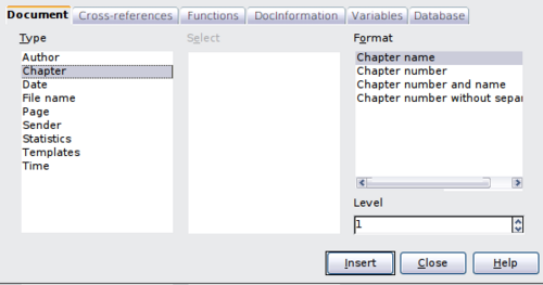 On the Document page, for Type, select Chapter and for Format, select Chapter name. Make sure that Layer is set to 1 and then click Insert.