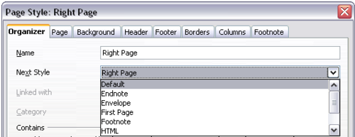 - On the Organizer page of the Page Style: Default dialog box, be sure Next Style is set to Default.