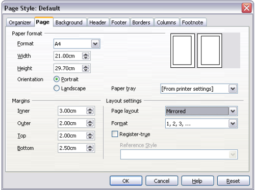 - On the Page page of the Page Style: Default dialog box, select Mirrored for Page layout and set the Inner and Outer margins to the same width as the Left and Right margins, respectively, on the Right Page style.