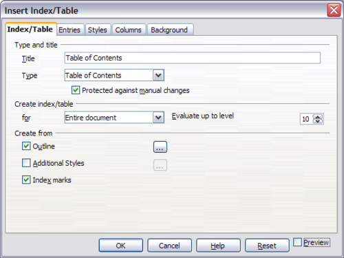 - From the main menu, choose Insert > Indexes and Tables > Indexes and Tables. The Insert Index/Table dialog box opens.