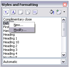- On the Paragraph Styles page of the Styles and Formatting window, right-click on Default and select Modify.