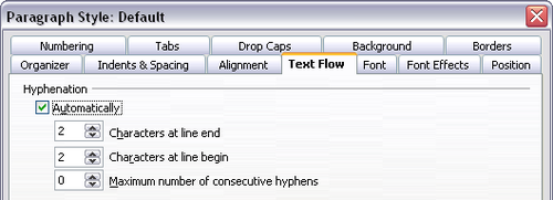 - Under Hyphenation, select or deselect the Automatically checkbox.