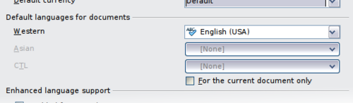 | Unlike the menu tool that applies to the individual document, a change in the default language from the Options dialog is a general change of settings of OOo and will therefore apply to all the documents created in the future. If you want to change the language for the current document only, be sure to select the For the current document only option.
