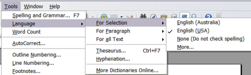 Spelling checking is available only for those languages in the list which have the symbol [[Image:]] next to them. If you do not see the symbol next to your preferred language, you can install the additional dictionary using Tools > Languages > More dictionaries online.