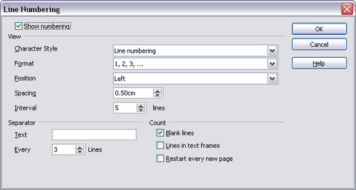 You can choose how many lines are numbered (for example, every line or every tenth line), the numbering type and whether numbers restart on each page. In addition, a text separator (any text you choose) can be set on a different numbering scheme (one every 12 lines, for example).