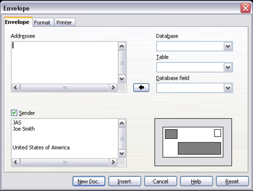 - In the Envelope dialog box, start with the Envelope tab. Verify, add, or edit the information in the Addressee and Sender boxes (the “from" on the envelope). You can use the right-hand drop-down lists to select the database or table from which you can draw the envelope information, if desired. See