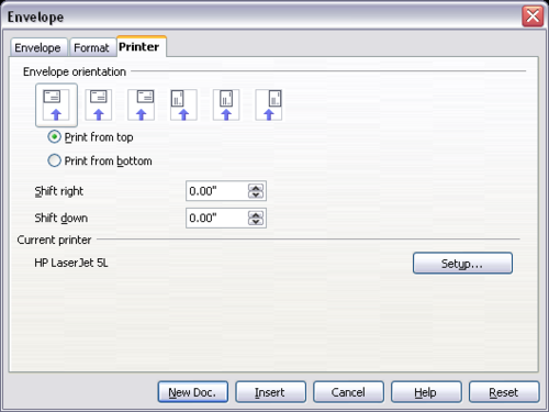- After formatting, go to the Printer page to choose printer options such as envelope orientation and shifting. You may need to experiment a bit to see what works best for your printer.