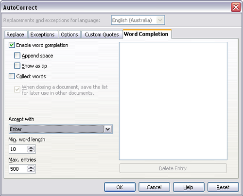 You can customize word completion from the Tools > AutoCorrect > Word Completion page: